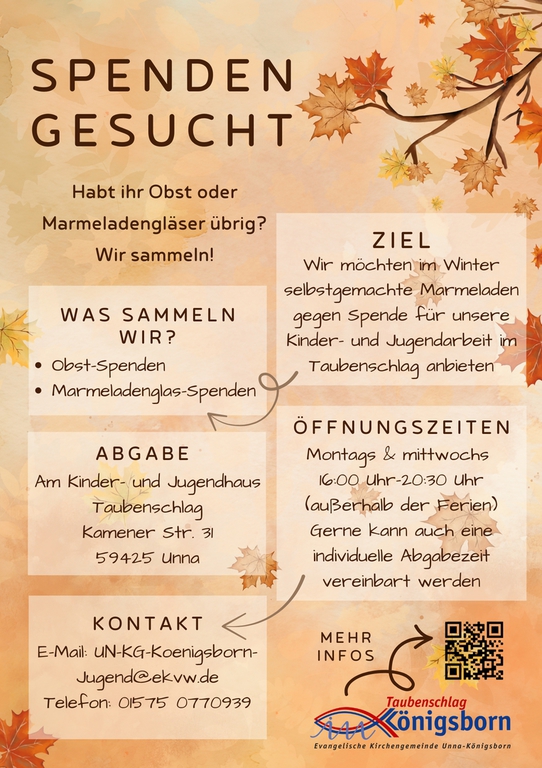 Wenn ihr also Obst oder Gläser übrig habt, dann kontaktiert uns gerne. Die Spenden können im Taubenschlag abgegeben werden.