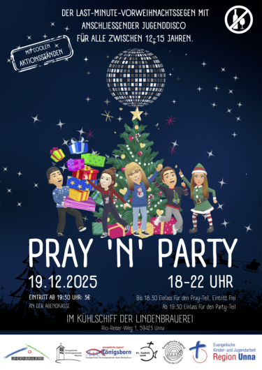 Am Freitag, den 19. Dezember laden die evangelischen Jugenden aus Hemmerde-Lünern, Massen, Unna und Unna-Königsborn wieder zur Pray ‘n‘ Party ins Kühlschiff der Lindenbrauerei ein. Diese Veranstaltung ist für unsere Region schon eine Tradition geworden und vor allem für die Konfirmand*innen der Region Unna soll es wieder ein Highlight ihres Konfi-Jahres werden. Für sie ist der Eintritt frei. Aber auch andere Jugendliche im Alter von 12 und 15 Jahren sind zu dieser vorweihnachtlichen Aktion herzlich willkommen. Zu Anfang wird es einen stimmungsvollen Jugendgottesdienst geben. Danach wird die Tanzfläche gestürmt und bei vielen Aktionenständen die Zeit vertrieben. Einlass ist ab 18 Uhr. Der Jugendgottesdienst startet um 18.30 Uhr. Während des Gottesdienstes ist kein Einlass möglich. Ende der Veranstaltung ist um 22 Uhr. Wir freuen uns auf euch!